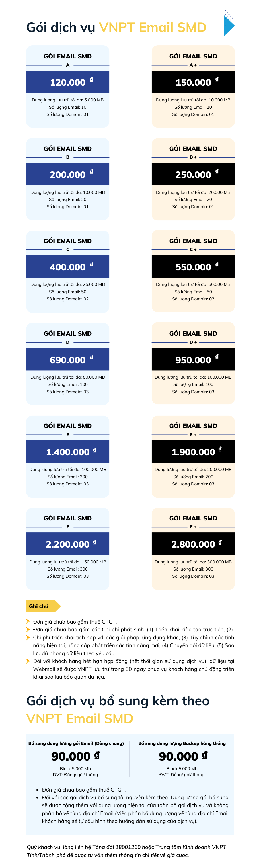 VNPT Email SMD là giải pháp Email dành cho cá nhân, doanh nghiệp có nhu cầu sử dụng địa chỉ Email theo tên miền riêng được vận hành trên hệ thống máy chủ điện toán đám mây của VNPT. Hệ thống được cấu hình tối ưu cho việc gửi và nhận thư điện tử, cùng với các giải pháp chống spam và chống virus hiệu quả, đảm bảo cho hoạt động giao dịch email của khách hàng luôn ổn định và nhanh chóng.