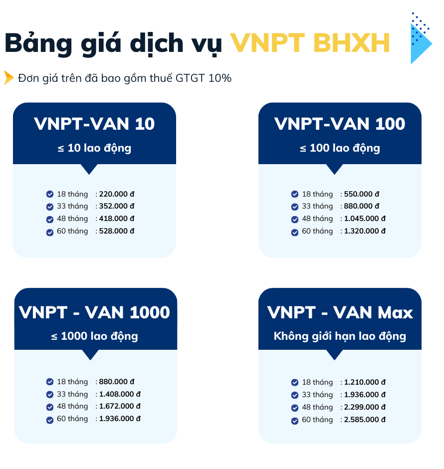 - Gói cước VNPT-VAN Max+VNPT-CA: không giới hạn số lượng lao động của tổ chức, doanh nghiệp, các đơn vị hành chính sự nghiệp.