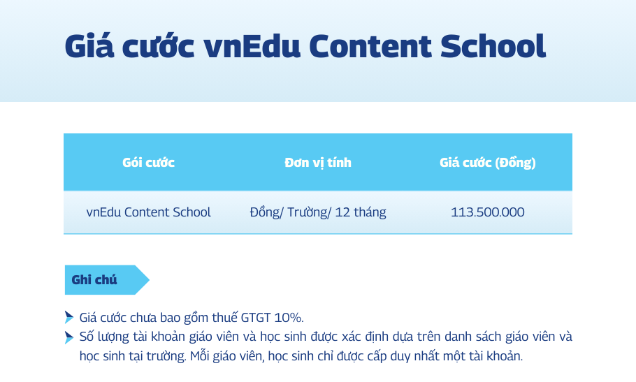 Ứng dụng dạy và học trực tuyến 3D gồm: Ứng dụng dạy học trực tuyến 3D (vnEdu Content Book): Là phần mềm Soạn bài giảng và dạy học 3D dành cho giáo viên, cung cấp kho học liệu số 3D đa dạng, phong phú, phù hợp với chương trình giảng dạy của Bộ Giáo dục và Đào tạo từ lớp 1 đến lớp 12, qua đó hỗ trợ giáo viên tạo ra những bài giảng sinh động, trực quan, các công cụ và trò chơi để học sinh có thể tiếp nhận các kiến thức nhanh chóng; Ứng dụng học trực tuyến 3D (vnEdu Content Web): Là phần mềm hỗ trợ học sinh phát huy tính tự học, tìm tòi tự khám phá tri thức của mỗi học sinh thông qua cảnh 3D, video, bài tập tương tác và bài học kỹ thuật số,... đồng thời giúp học sinh ôn lại những kiến thức đã được học tại lớp. Gói cước vnEdu Content School: Trọn gói cho nhà trường. Đây là hình thức đóng gói dịch vụ mới. Nhà trường được VNPT cấp phát tài khoản cho Giáo viên và học sinh theo biến động thực tế. Đơn vị tính sản lượng: Trường/ Năm. Điều kiện: Giáo viên và Học sinh phải nằm trong danh sách do trường quản lý. Mỗi Giáo viên, Học sinh chỉ được cấp duy nhất một tài khoản.