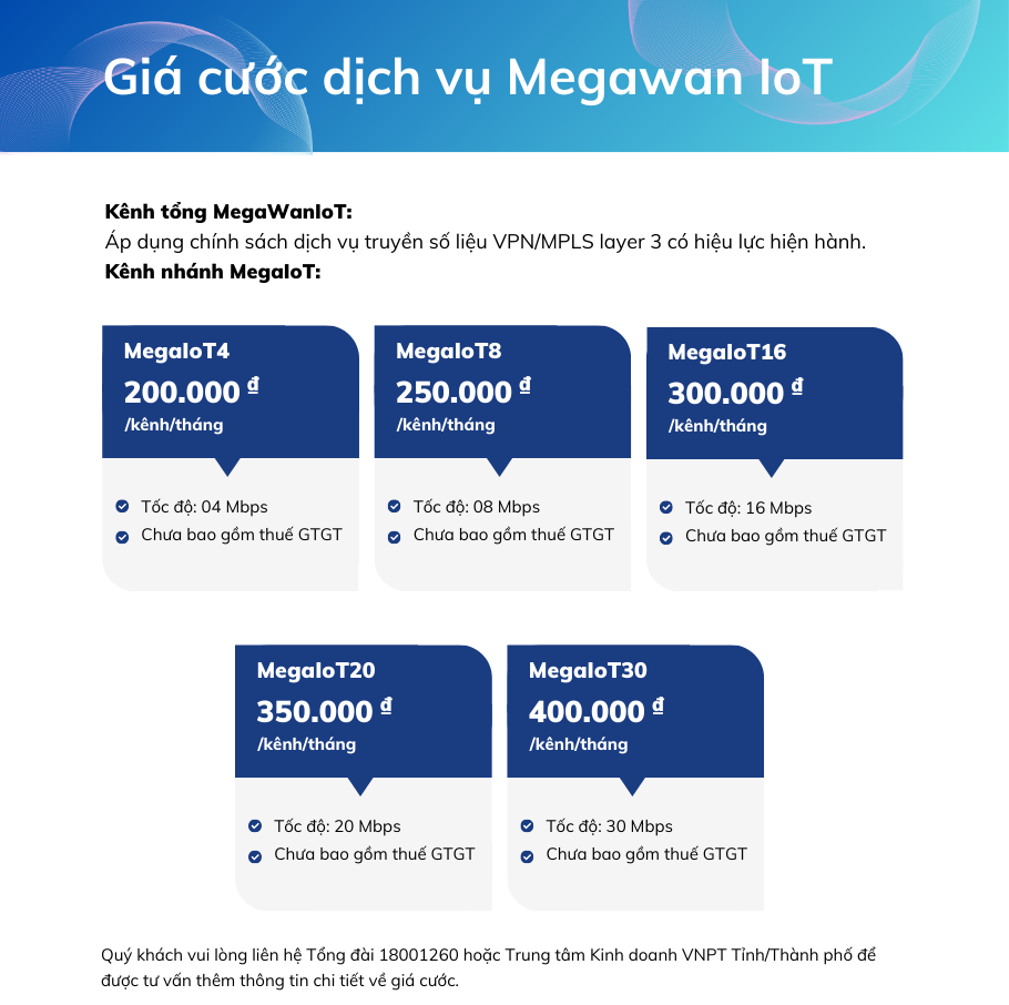 - Kênh tổng MegaWanIoT: là dịch vụ truyền số liệu VPN/MPLS layer 3 sử dụng làm kênh gom cho các kết nối IoT/Camera.