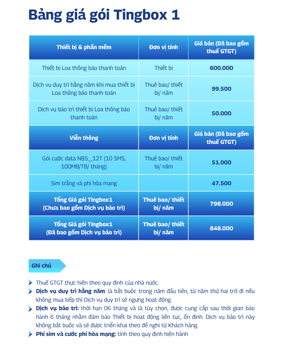 Giải pháp Loa thông báo thanh toán - Gói Tingbox 1 là SPDV nhằm hỗ trợ nhận diện và xác nhận giao dịch thanh toán thông qua tín hiệu âm thanh tại các điểm bán hàng, quầy thu ngân, hệ thống POS hoặc nền tảng thanh toán điện tử.
