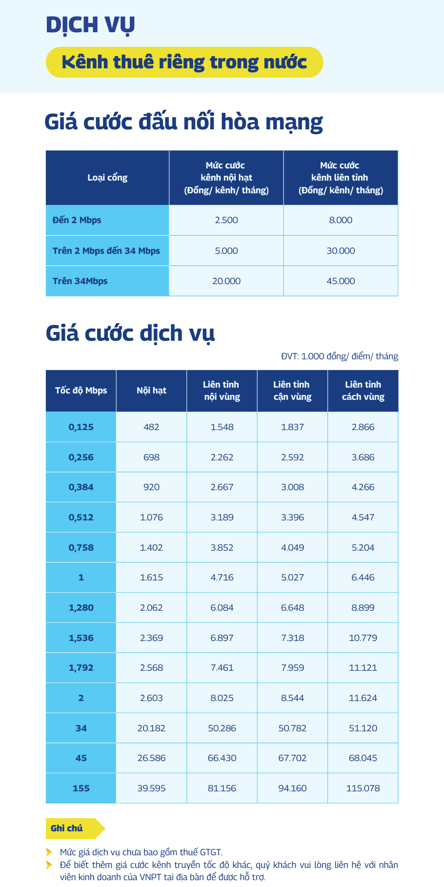 Dịch vụ kênh thuê riêng (còn gọi là leased line): là dịch vụ cho thuê đường truyền dẫn vật lý dùng riêng để kết nối và truyền thông tin giữa các thiết bị đầu cuối trong mạng nội bộ, mạng viễn thông dùng riêng của khách hàng tại hai hay nhiều địa điểm cố định khác nhau với các tốc độ theo yêu cầu cụ thể của khách hàng. Hiện VNPT cung cấp 2 loại hình kênh thuê riêng theo công nghệ là SDH và EoSDH với phạm vi kết nối cả trong nước lẫn quốc tế.