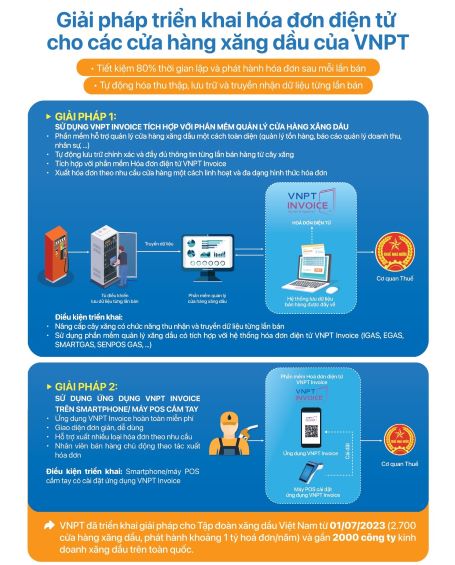 Hiện nay VNPT đang triển khai và giới thiệu các giải pháp triển khai HĐĐT cho các cửa hàng bán lẻ xăng dầu như: Sử dụng phần mềm VNPT Invoice tích hợp với phần mềm quản lý cửa hàng xăng dầu và Sử dụng phần mềm Invoice mobile app trên Smartphone/ máy POS cầm tay.