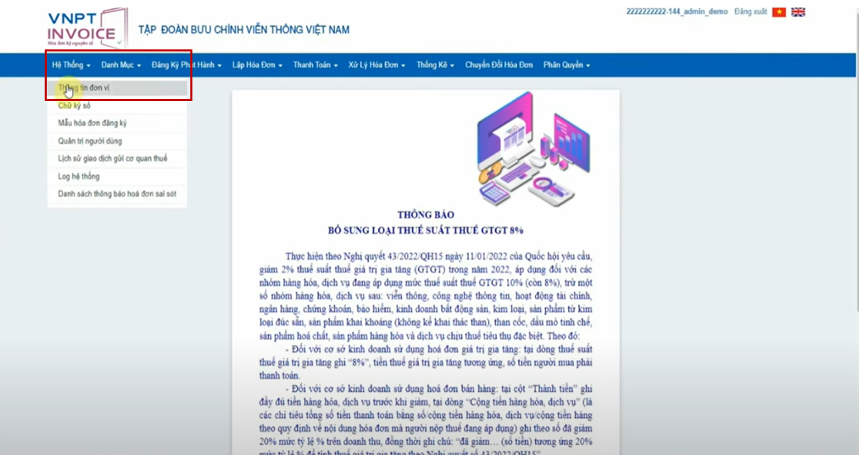 Trên thanh menu, khách hàng bấm chọn “Hệ thống” >> “Thông tin đơn vị”.