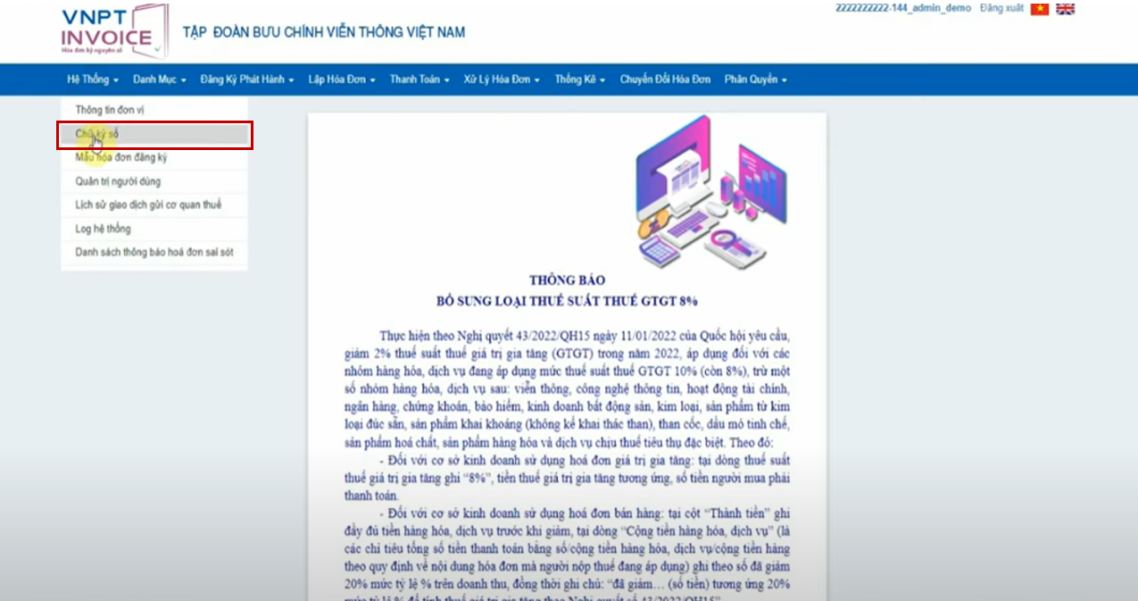 Để cập nhật thông tin về chữ ký số, trên thanh menu, khách hàng bấm chọn “Hệ thống” >> “Chữ ký số”.