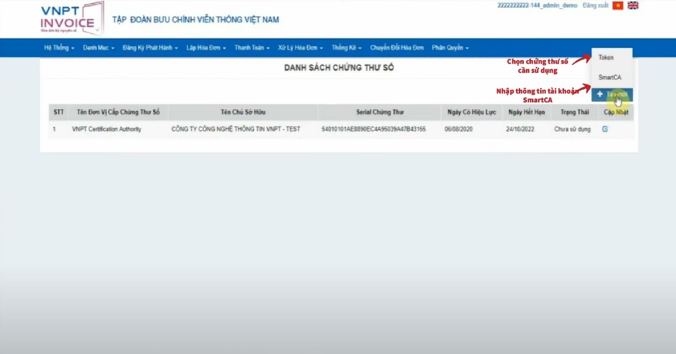 Trường hợp doanh nghiệp sử dụng SmartCA, khách hàng bấm "Tạo mới" >> "SmartCA" và tiến hành nhập thông tin tài khoản smartCA.