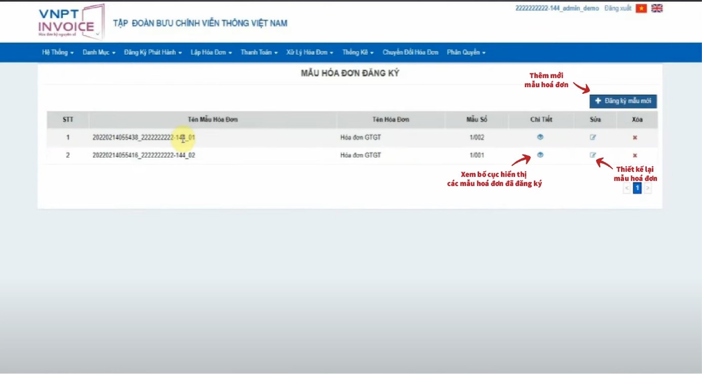 Tại giao diện này, khách hàng bấm vào biểu tượng con mắt ở cột chi tiết để xem bố cục hiển thị các mẫu đã đăng ký; bấm nút “đăng ký mẫu mới” để thực hiện thêm mẫu hóa đơn hoặc có thể bấm nút “Sửa” để cập nhật lại logo, khung viền hay ảnh nền hoá đơn tuỳ theo mong muốn.