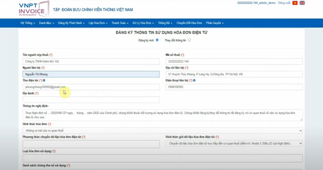 Tiếp theo, khách hàng lựa chọn “Tạo mới” và tiến hành nhập các thông tin vào tờ khai đăng ký thông tin sử dụng dịch vụ hoá đơn điện tử.