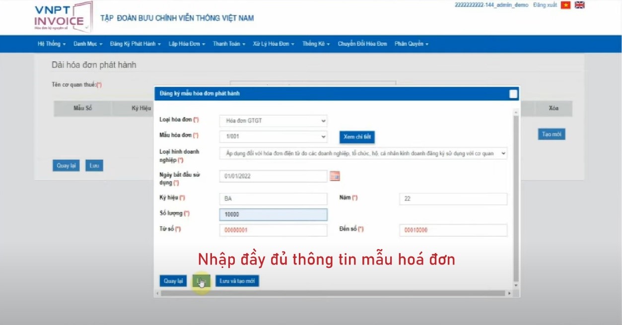 Tại đây, khách hàng bấm chọn "Tạo mới", nhập đầy đủ thông tin đăng ký dải ký hiệu hóa đơn gồm:Loại hóa đơn, mẫu hóa đơn, loại áp dụng hóa đơn, ký hiệu, số lượng hóa đơn. Kết thúc thao tác bằng việc bấm "Lưu" hoặc "Lưu và tạo mới".