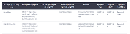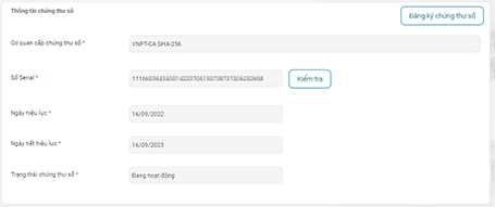 Bước 3: Sau khi chọn mục Đăng ký chứng thư số màn hình sẽ xuất hiện thông tin về chứng thư số trên USB Token bao gồm các trường thông tin: Nhà cung cấp dịch vụ chứng thư số công cộng; Tên người sử dụng chứng thư số; Tên đơn vị của người sử dụng chứng thư số; Số chứng thực của người sử dụng chứng thư số; Số serial; Ngày hiệu lực; Ngày hết hiệu lực; Trạng thái hoạt động.