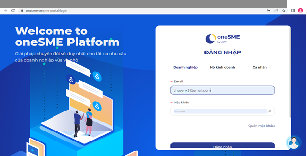 Bước 4: Khách hàng sử dụng tài khoản bao gồm email và mật khẩu đã đặt để thực hiện Đăng nhập vào oneSME và mua các sản phẩm dịch vụ VT-CNTT theo nhu cầu