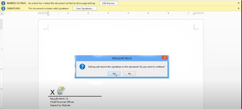 Nếu chọn mục này thì màn hình sẽ hiển thị câu hỏi rằng “Việc chỉnh sửa sẽ làm mất đi những chữ ký trong văn bản. Bạn có muốn tiếp tục không?” Nếu lựa chọn Yes thì chữ ký số sẽ mất đi và văn bản sẽ không có hiệu lực.