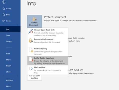 - Bước 3: Chọn Protect Document → Chọn Add a Digital Signature
