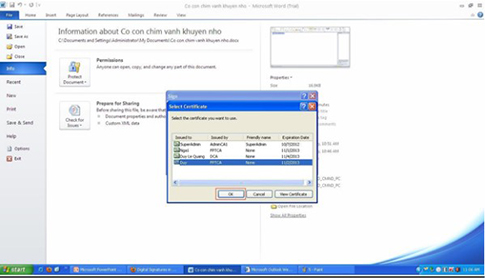- Bước 6: Màn hình sẽ hiện lên cửa sổ Select Certificate, bạn cần chọn đúng tên người ký → chọn OK