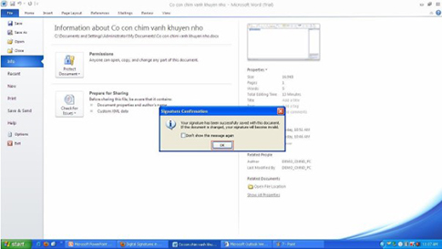 Đến đây, việc tạo mẫu chữ ký số trên văn bản word 2010 đã hoàn thành, bạn thực hiện lưu văn bản và gửi sang cho người ký để xác thực cho các loại giấy tờ. Hình thức này cho phép bạn đưa văn bản, xin chữ ký qua các đường điện tử như email, fax,... mà không cần phải đưa tới trực tiếp.