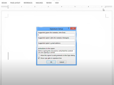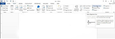 - Bước 2: Chọn mục Signature Line trên thanh công cụ và màn hình sẽ hiển thị như hình dưới đây.