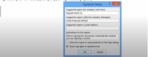 Ví dụ: Bạn điền tên người cần ký là Nguyễn Văn Cò, chức vụ là Chief Financial Officer vào ô.