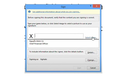 - Bước 2: Nháy đúp chuột vào chỗ ký, màn hình sẽ hiển thị như sau → Chọn Select Image để chèn hình logo của công ty hoặc mẫu hình chữ ký tay của mình.