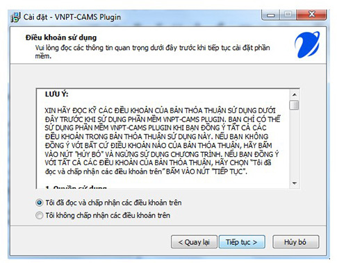 Khi màn hình hiển thị, người dùng bấm “Tiếp tục” → tích vào “Tôi đã đọc và chấp nhận các điều khoản trên” → nhấn ‘Tiếp tục” để thực hiện cài đặt.
