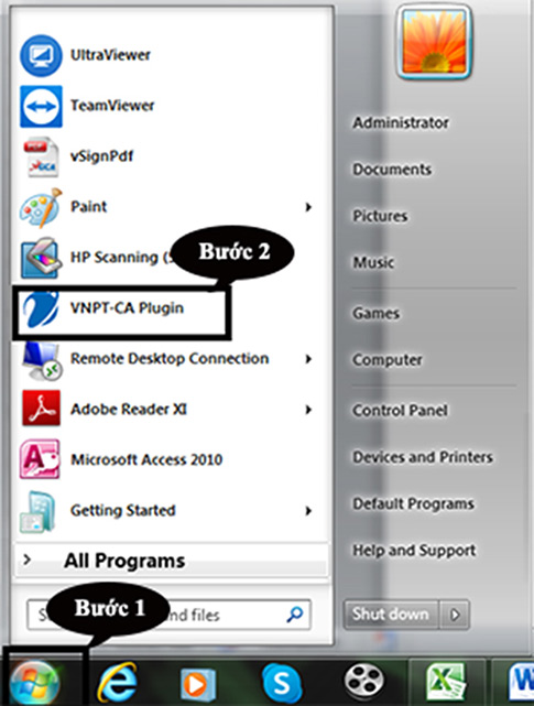 Bước 3: Nếu đã cài đặt, người dùng vào biểu tượng cửa sổ Window ở góc trái màn hình → biểu tượng VNPT-CA Plugin để chạy lại chương trình.
