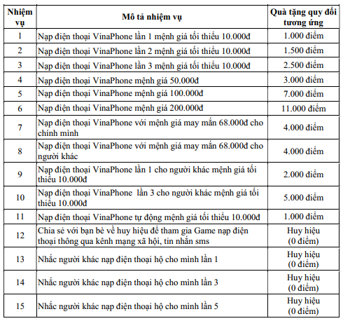 Ví dụ: Khách hàng thực hiện nhiệm vụ số 8 lần đầu tiên “Nạp điện thoại VinaPhone với mệnh giá may mắn 68.000đ cho người khác” thì khách hàng sẽ được nhận điểm của các nhiệm vụ số 1+8+9, tương đương với tổng điểm tích luỹ là: 1.000 điểm + 4.000 điểm + 2.000 điểm = 7.000 điểm.