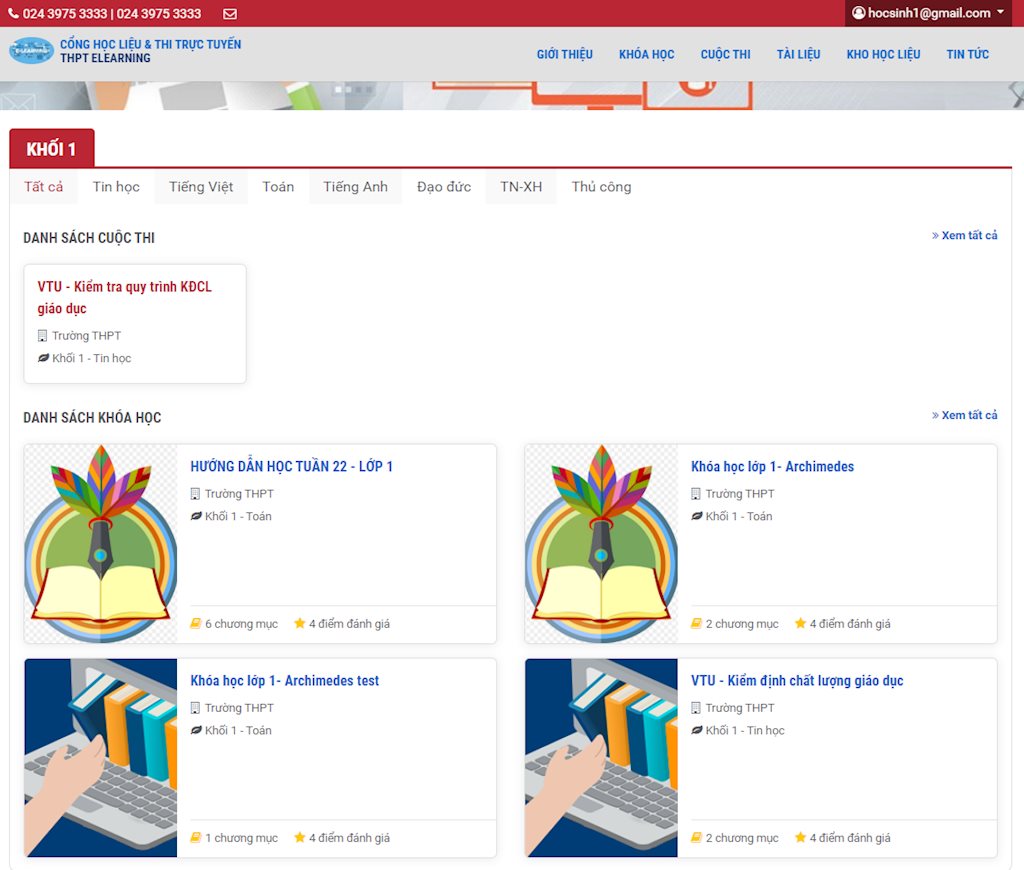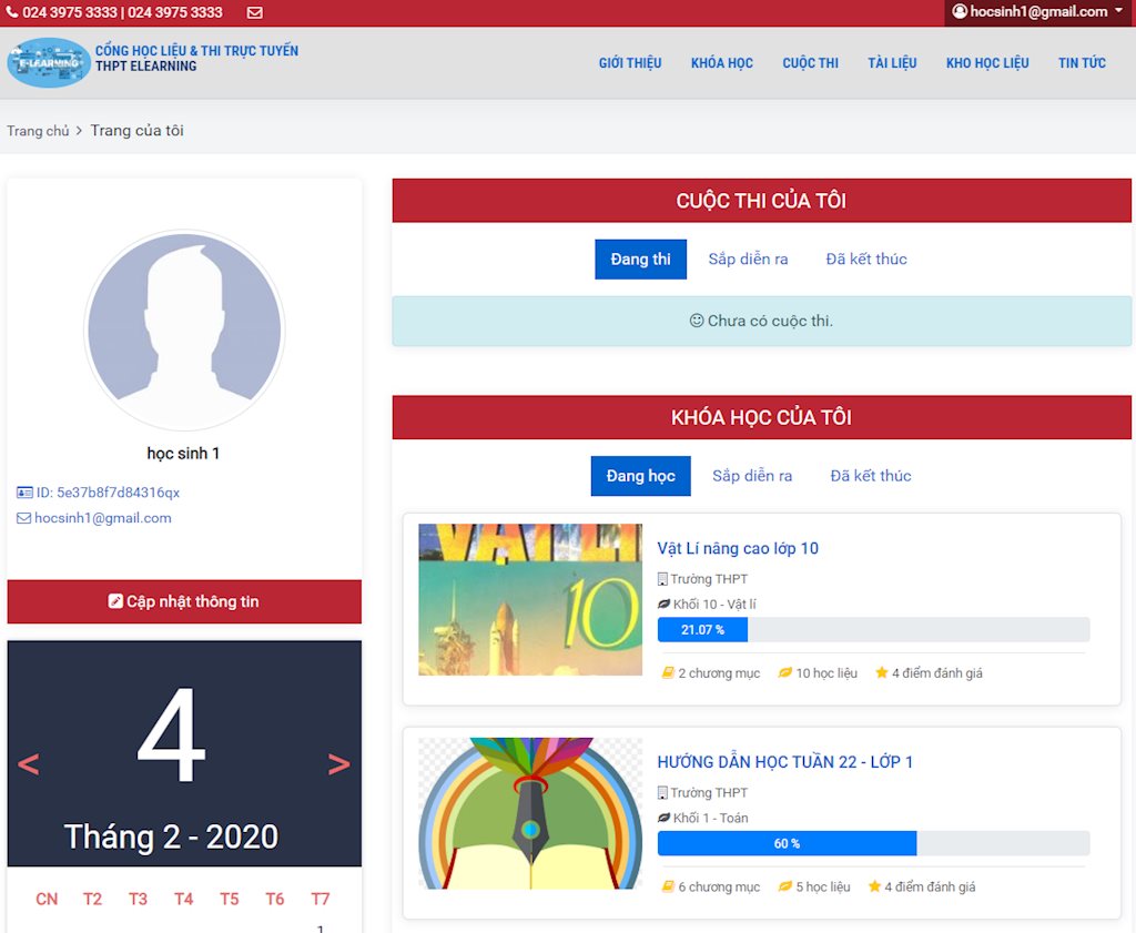 Tại trang cá nhân trên hệ thống học sinh sẽ thấy danh sách các khóa học và cuộc thi của mình. Hoặc tại trang chủ học sinh có thể theo dõi các khóa học và cuộc thi hiện hành của các khối, các môn học.