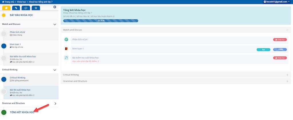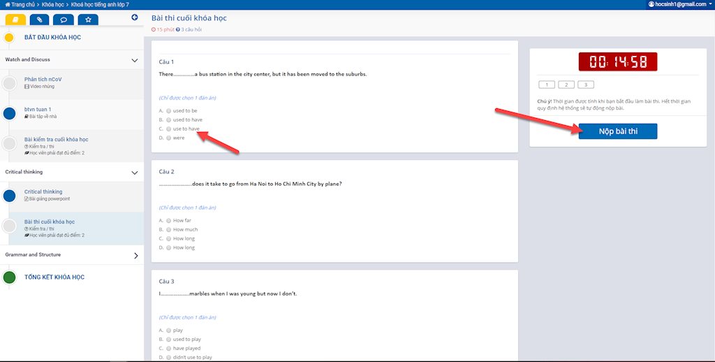 Nếu khóa học có bài kiểm tra: click vào bài kiểm tra => Tham gia thi => Nộp bài => Xem kết quả.