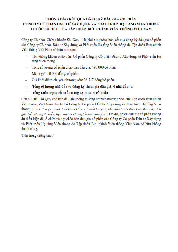 Tập đoàn Bưu chính Viễn thông Việt Nam - VNPT thông báo kết quả đăng ký đấu giá cổ phần của CTCP Đầu tư Xây dựng và Phát triển Hạ tầng Viễn thông do Tập đoàn Bưu chính Viễn thông Việt Nam sở hữu.