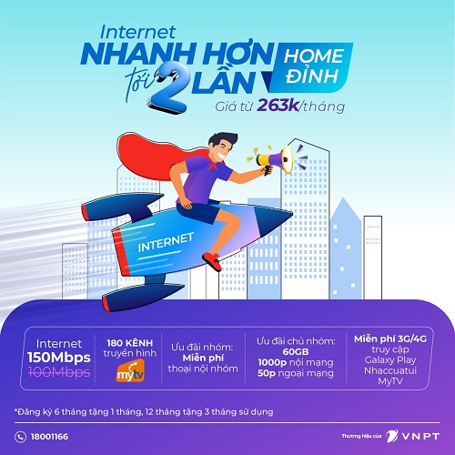 Ưu đãi này áp dụng cho các gói Home của VNPT. Khách hàng sẽ được trải nghiệm mạng internet vừa nhanh vừa rẻ.