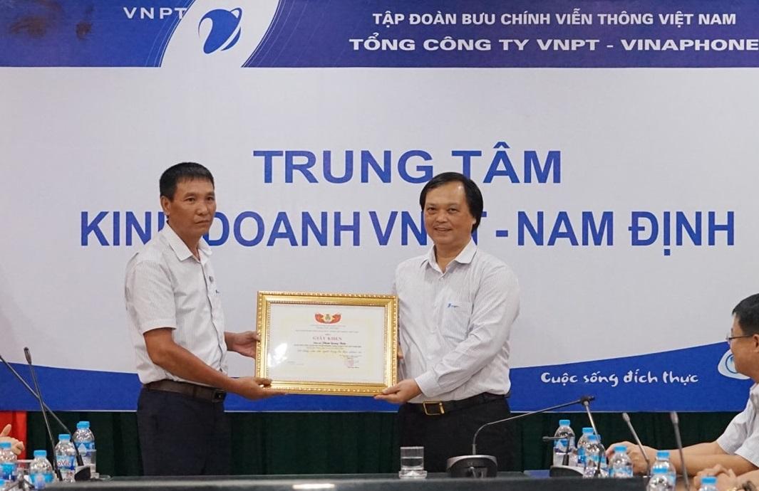 Chủ tịch Công đoàn VinaPhone Hoàng Minh Cường trao tặng giấy khen của Công đoàn VNPT cho anh Phạm Quang Thiện