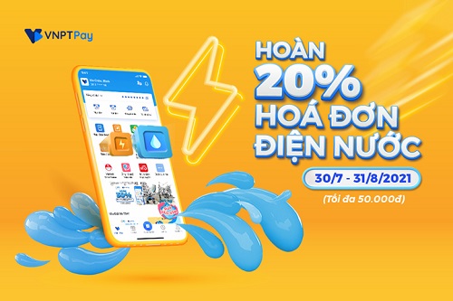 Từ ngày 30/7/2021 - 31/8/2021, VNPT Pay triển khai chương trình Thanh toán điện nước siêu tiện, siêu nhanh trên phạm vi toàn quốc. Chương trình ưu đãi giúp khách hàng được hoàn tiền 20% giá trị hóa đơn (tối đa 50.000đ/khách hàng) vào tài khoản ví VNPT Pay.