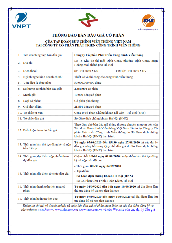 Thông báo đấu giá cổ phần của Tập đoàn Bưu chính Viễn thông Việt Nam tại CTCP Phát triển công trình Viễn thông