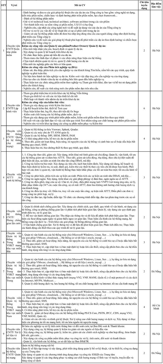 Tổng Công ty Hạ tầng mạng (VNPT Net) là đơn vị trực thuộc Tập đoàn Bưu chính Viễn thông Việt Nam có nhu cầu tuyển dụng bổ sung nhân sự trong lĩnh vực công nghệ thông tin. Kính mời những ứng viên xuất sắc tham gia tuyển dụng cho các vị trí sau: