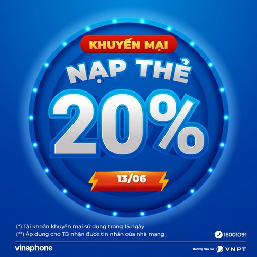 Trong ngày 13/6, thuê bao trả trước của VinaPhone khi nhận được tin nhắn khuyến mại từ nhà mạng và tiến hành nạp thẻ, sẽ nhận được 20% giá trị thẻ nạp.