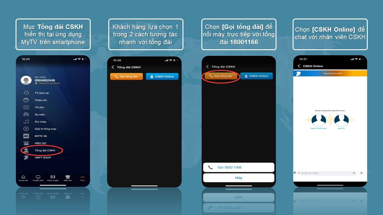 Bộ phận tổng đài chăm sóc khách hàng của hệ thống dịch vụ truyền hình và ứng dụng MyTV nay đã có thể được kết nối ngay lập tức với khách hàng thông qua tính năng Tổng đài CSKH (Chăm sóc khách hàng) có mặt trên ứng dụng MyTV thiết bị smartphone. Chỉ bằng những thao tác lướt màn hình điện thoại vô cùng đơn giản, những thắc mắc của khách hàng sẽ được giải đáp kịp thời, hỗ trợ cho khách hàng sử dụng dịch vụ và ứng dụng MyTV một cách chu đáo và toàn diện hơn, giúp gia tăng mức độ hài lòng của khách hàng khi trải nghiệm dịch vụ. Khách hàng sẽ có 2 lựa chọn khi kết nối với Tổng đài chăm sóc khách hàng. Đó là hình thức Gọi trực tiếp hoặc thực hiện nhắn tin đến Tổng đài.