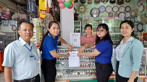 Nhân viên VNPT trực tiếp đến các cơ sở, kinh doanh mua bán tại chợ Tuyên Nhơn hỗ trợ dán mã QR Code.