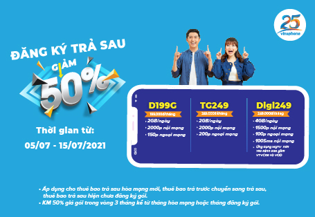 Nhân dịp kỷ niệm sinh nhật 25 năm, từ 05/07 – 15/07/2021, VinaPhone triển khai chương trình khuyến mại “Đăng ký trả sau – Giảm 50%” dành cho thuê bao trả sau hòa mạng mới, thuê bao chuyển đổi từ trả trước sang trả sau và thuê bao trả sau hiện chưa đăng ký gói.