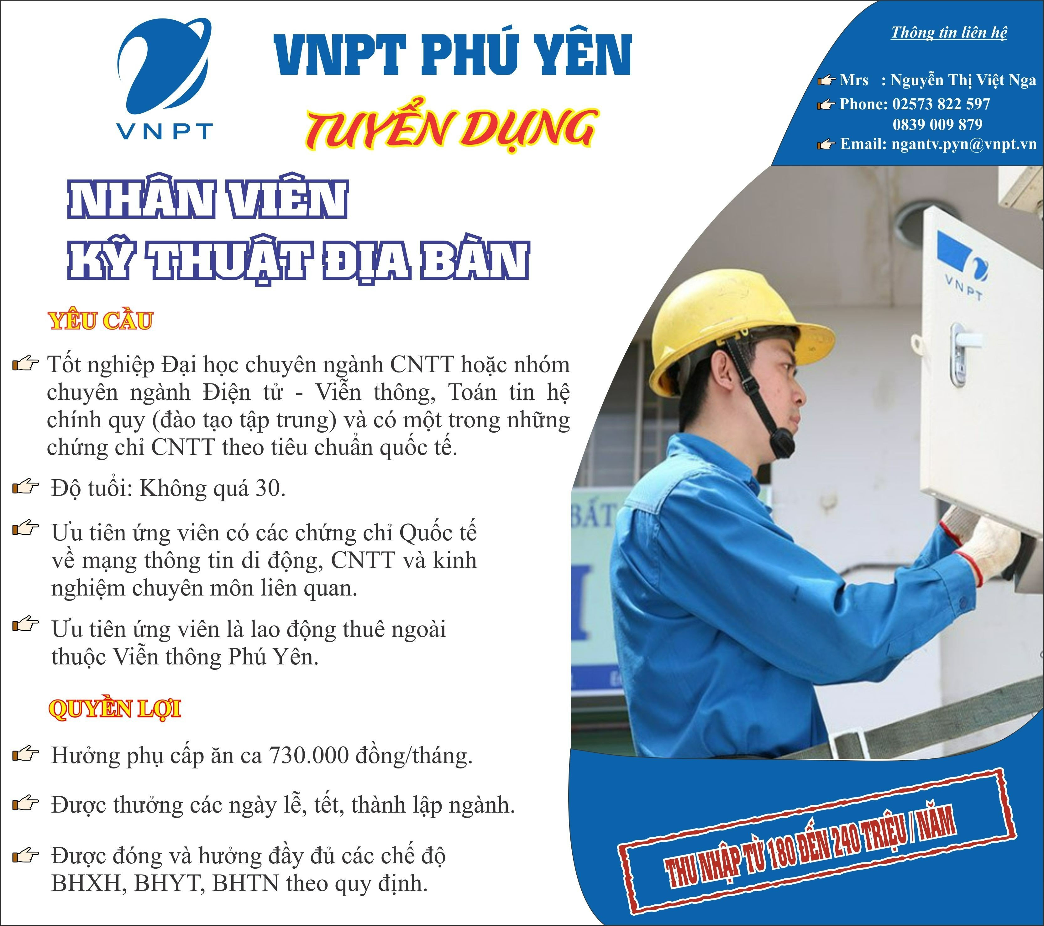 Viễn thông Phú Yên cần tuyển 02 Nhân viên kỹ thuật làm việc trên địa bàn tỉnh Phú Yên, cụ thể như sau: