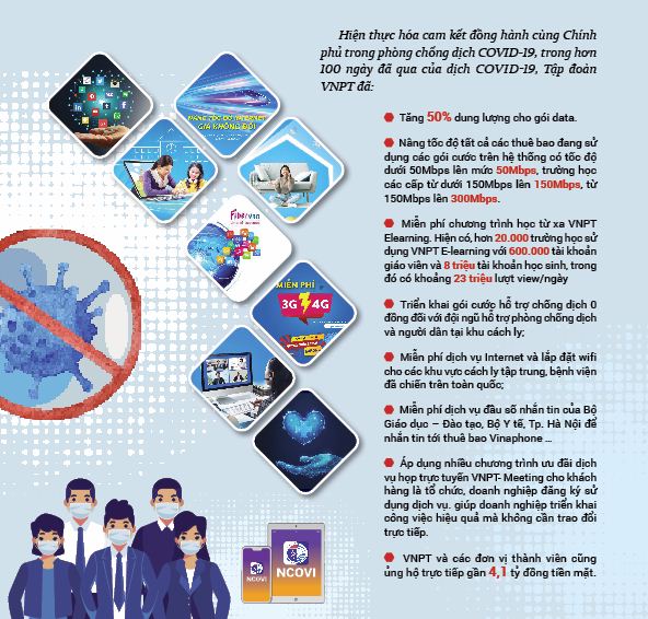 Chia sẻ khó khăn cùng người dân và đồng hành cùng Chính phủ trong cuộc chiến chống lại Covid-19, trong thời gian qua, VNPT đã cung cấp hàng loạt các ứng dụng, giải pháp về khai báo y tế, thương mại điện tử và làm việc - học tập - khám chữa bệnh từ xa, cùng với đó là các hoạt động ủng hộ trang thiết bị bảo hộ và tiền mặt cho đội ngũ chống dịch.