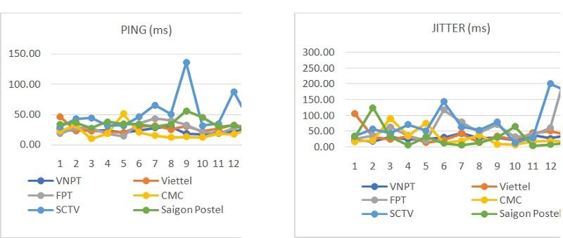 Thống kê các tham số sâu hơn về chất lượng (Ping, Jitter - các tham số đặc biệt ảnh hưởng đến các dịch vụ đòi hỏi chất lượng cao như thoại, video) cho thấy kết nối Internet Việt Nam đáp ứng được mức tiêu chuẩn khuyến nghị. Một vài nhà mạng trong một số thời điểm có chỉ tiêu này chưa đạt yêu cầu, có thể ảnh hưởng đến chất lượng sử dụng dịch vụ thoại, video streaming trên Internet, thể hiện ở hiện tượng méo tiếng, vỡ hình, đặc biệt khi nhiều thiết bị người dùng chia sẻ một kênh đồng thời.