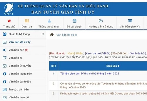 Giao diện Hệ thống xử lý văn bản điều hành Ban Tuyên giáo Tỉnh ủy Hải Dương