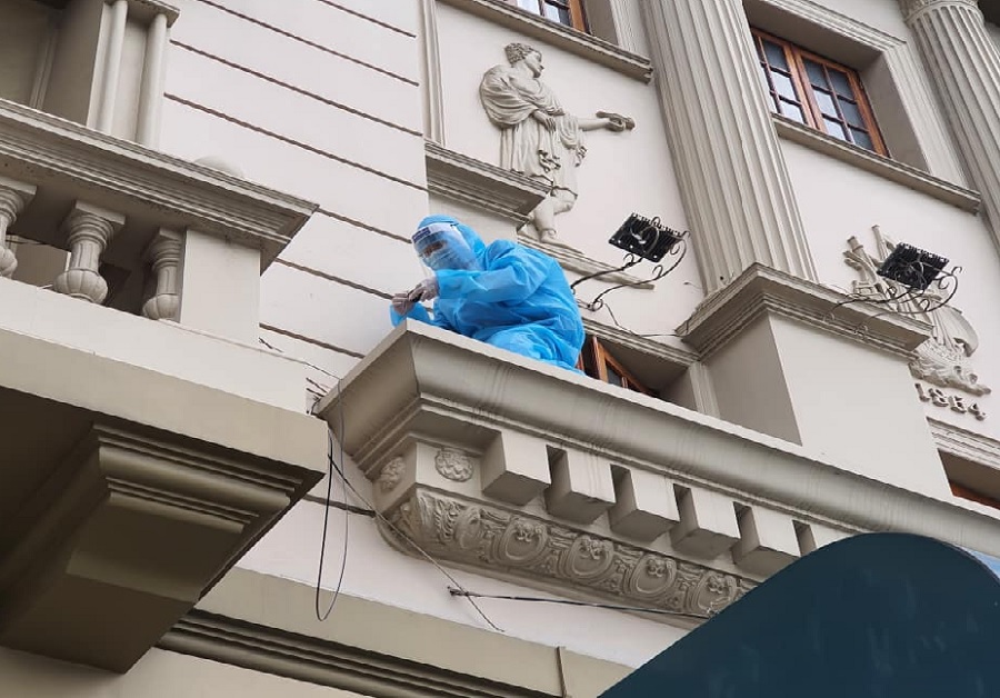 | Các kỹ thuật viên VNPT TP HCM thực hiện nghiên túc khuyến cáo 5K của Bộ Y tế khi ra vào khu cách ly |