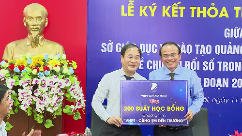 Phát biểu tại Lễ ký kết, Giám đốc Sở GD&ĐT Nguyễn Ngọc Thái đánh giá cao năng lực của VNPT trong CĐS và hy vọng thông qua việc ký kết thỏa thuận hợp tác sẽ giúp ngành giáo dục bứt phá trong công tác CĐS. Dịp này, VNPT Quảng Ngãi trao 200 suất học bổng của Chương trình "VNPT - Cùng em đến trường", mỗi suất trị giá 500 nghìn đồng cho học sinh nghèo trên địa bàn tỉnh.