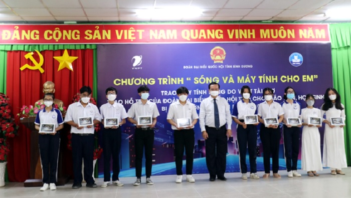 Tại buổi lễ, VNPT Bình Dương đã trao trực tiếp 10 máy tính bảng cho học sinh có hoàn cảnh khó khăn trên địa bàn tỉnh và trao tượng trưng 2.278 máy tính bảng cùng 2.278 SIM 4G kèm theo cho học sinh có hoàn cảnh khó khăn tại các trường Tiểu học, THCS, THPT trên địa bàn tỉnh với tổng giá trị gần 6 tỷ đồng.