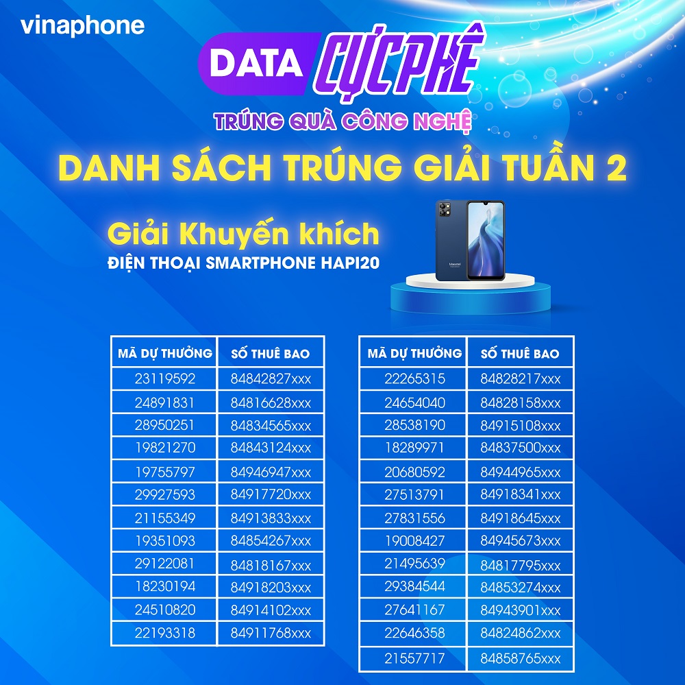 Chương trình khuyến mại "Data cực phê - Trúng quà công nghệ" được VinaPhone tổ chức từ ngày 6/3 đến hết 30/4/2023 với 360 giải thưởng tổng giá trị hơn 2 tỷ đồng dành cho khách hàng. Để nhận mã dự thưởng khách hàng là thuê bao VinaPhone chỉ cần đăng ký hoặc gia hạn các gói cước từ 20.000đ.