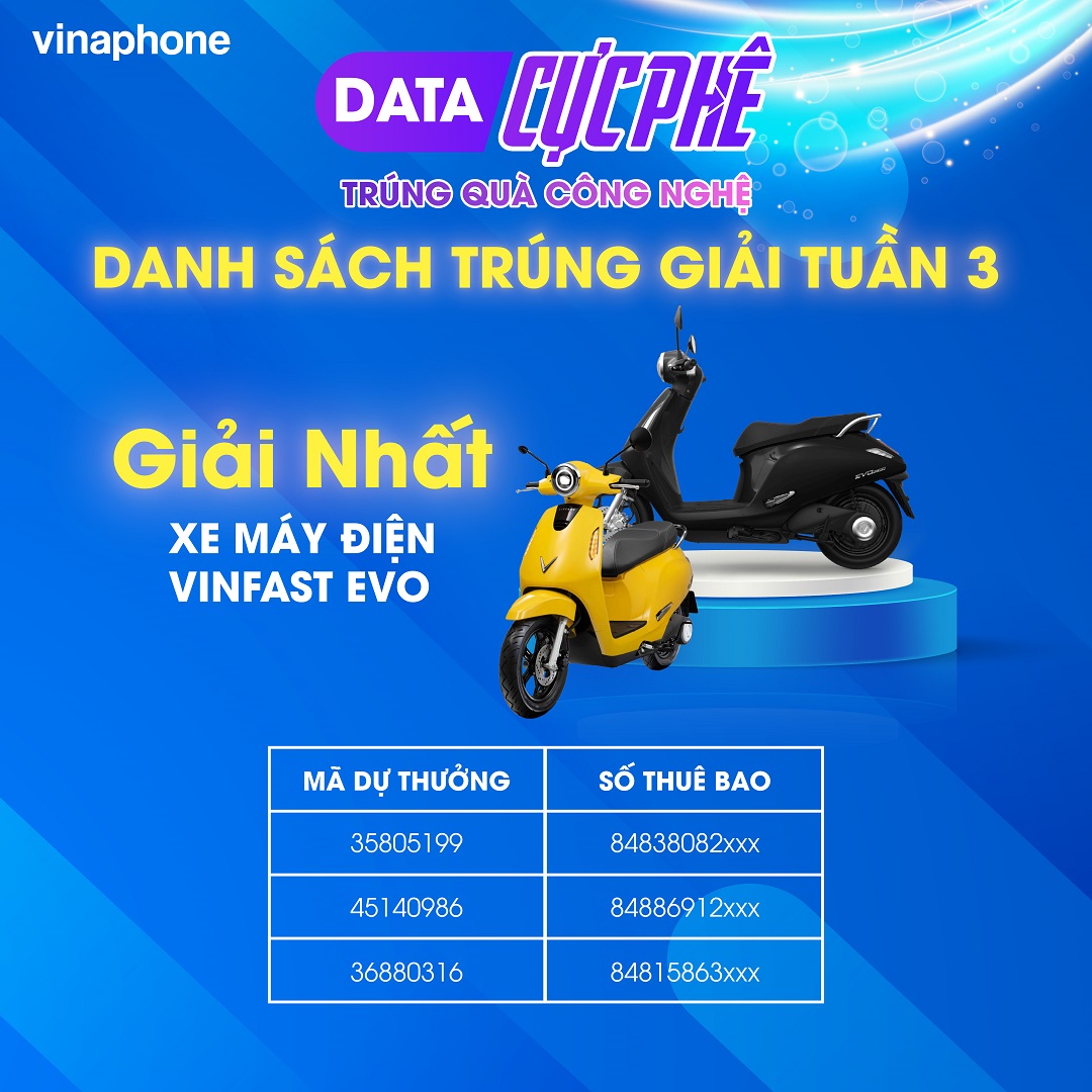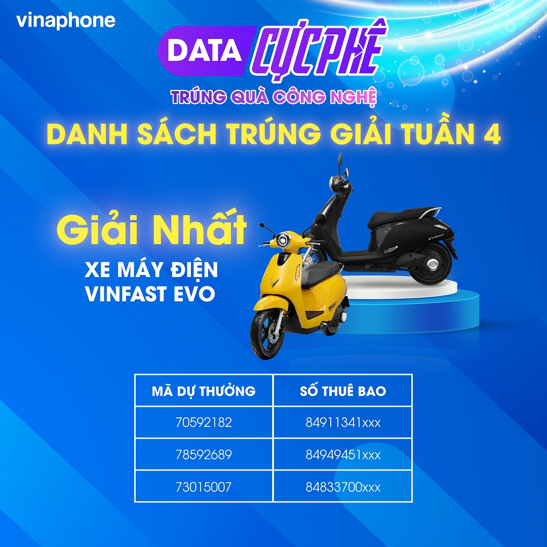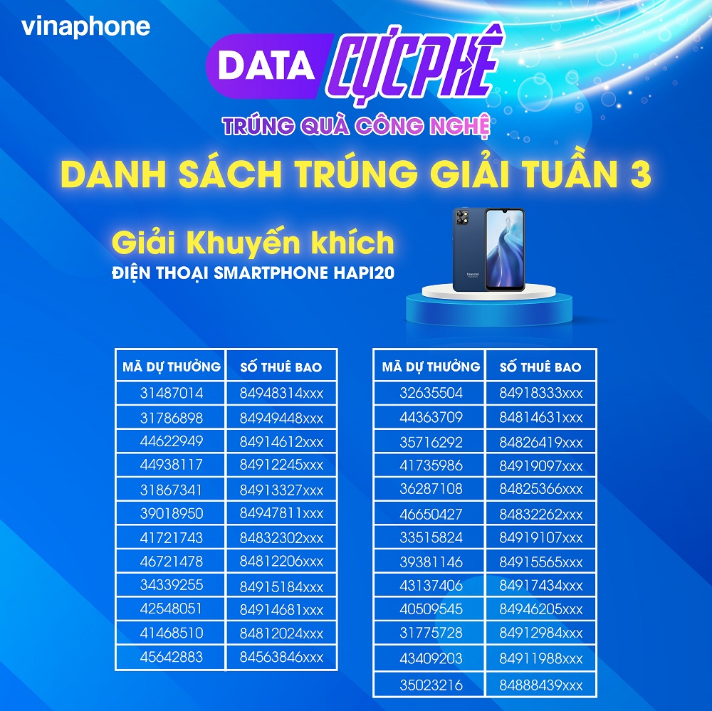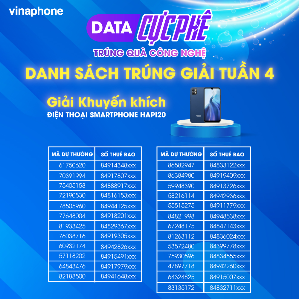 Trong các ngày 28/3 và 4/4 vừa qua, VinaPhone tiếp tục quay thưởng tuần 3 và tuần 4 chương trình khuyến mại "Data cực phê - Trúng quà công nghệ". Chúc mừng các khách hàng may mắn đã trở thành những chủ nhân tiếp theo của hàng loạt phần thưởng hấp dẫn trong chương trình.