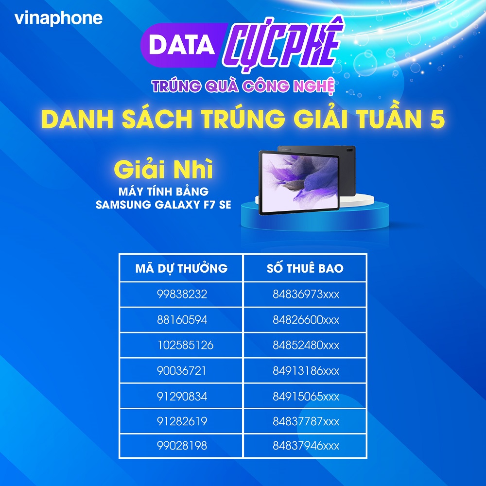 Trong các ngày 11/4 và 18/4 vừa qua, VinaPhone tiếp tục quay thưởng tuần 5 và tuần 6 chương trình khuyến mại "Data cực phê - Trúng quà công nghệ". Chúc mừng các khách hàng may mắn đã trở thành những chủ nhân tiếp theo của hàng loạt phần thưởng hấp dẫn trong chương trình.