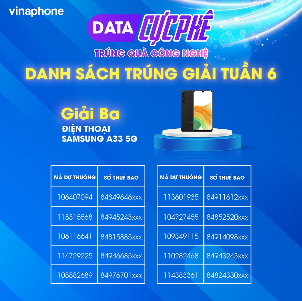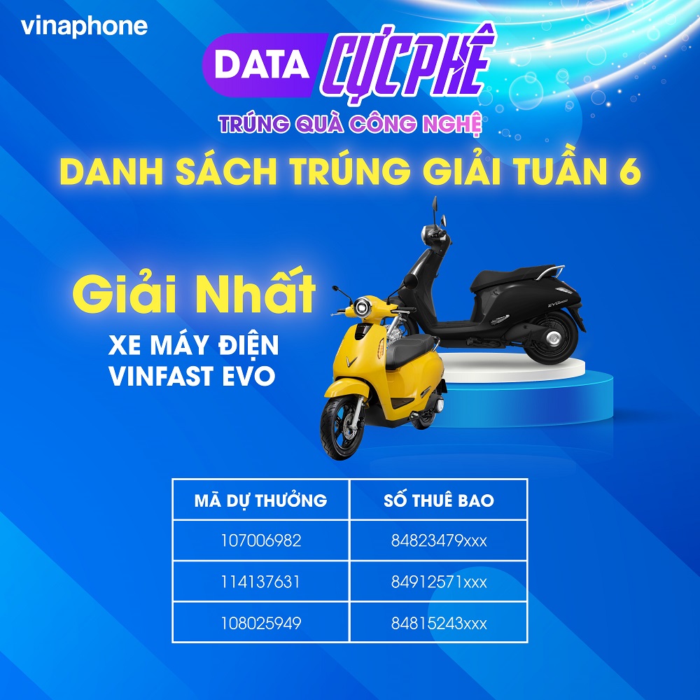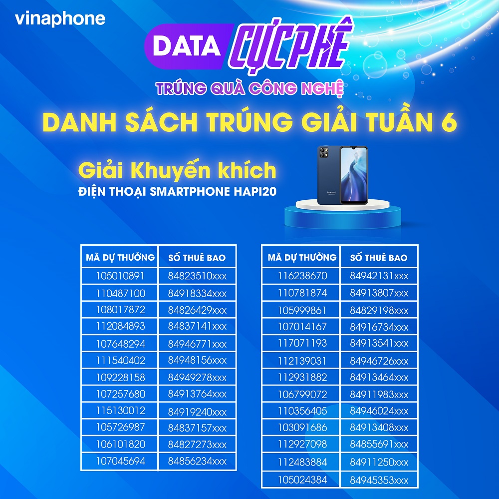 Chương trình khuyến mại "Data cực phê - Trúng quà công nghệ" được VinaPhone tổ chức từ ngày 6/3 đến hết 30/4/2023 với 360 giải thưởng tổng giá trị hơn 2 tỷ đồng dành cho khách hàng. Để nhận mã dự thưởng khách hàng là thuê bao VinaPhone chỉ cần đăng ký hoặc gia hạn các gói cước từ 20.000đ.