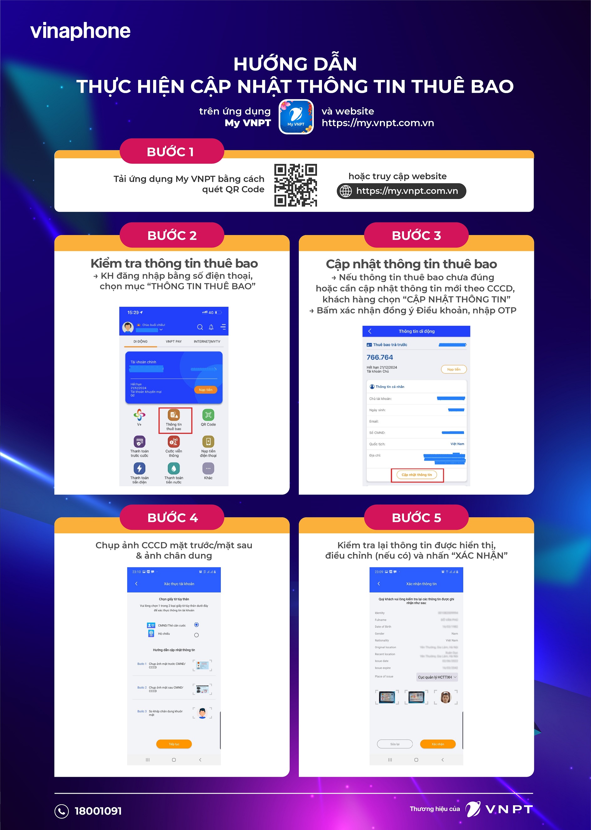 Tổng đài chăm sóc khách hàng 18001091 của VinaPhone hoạt động 24/7 sẽ hỗ trợ, giải đáp khách hàng mọi thông tin cần thiết trong quá trình chuẩn hóa lại thông tin thuê bao.