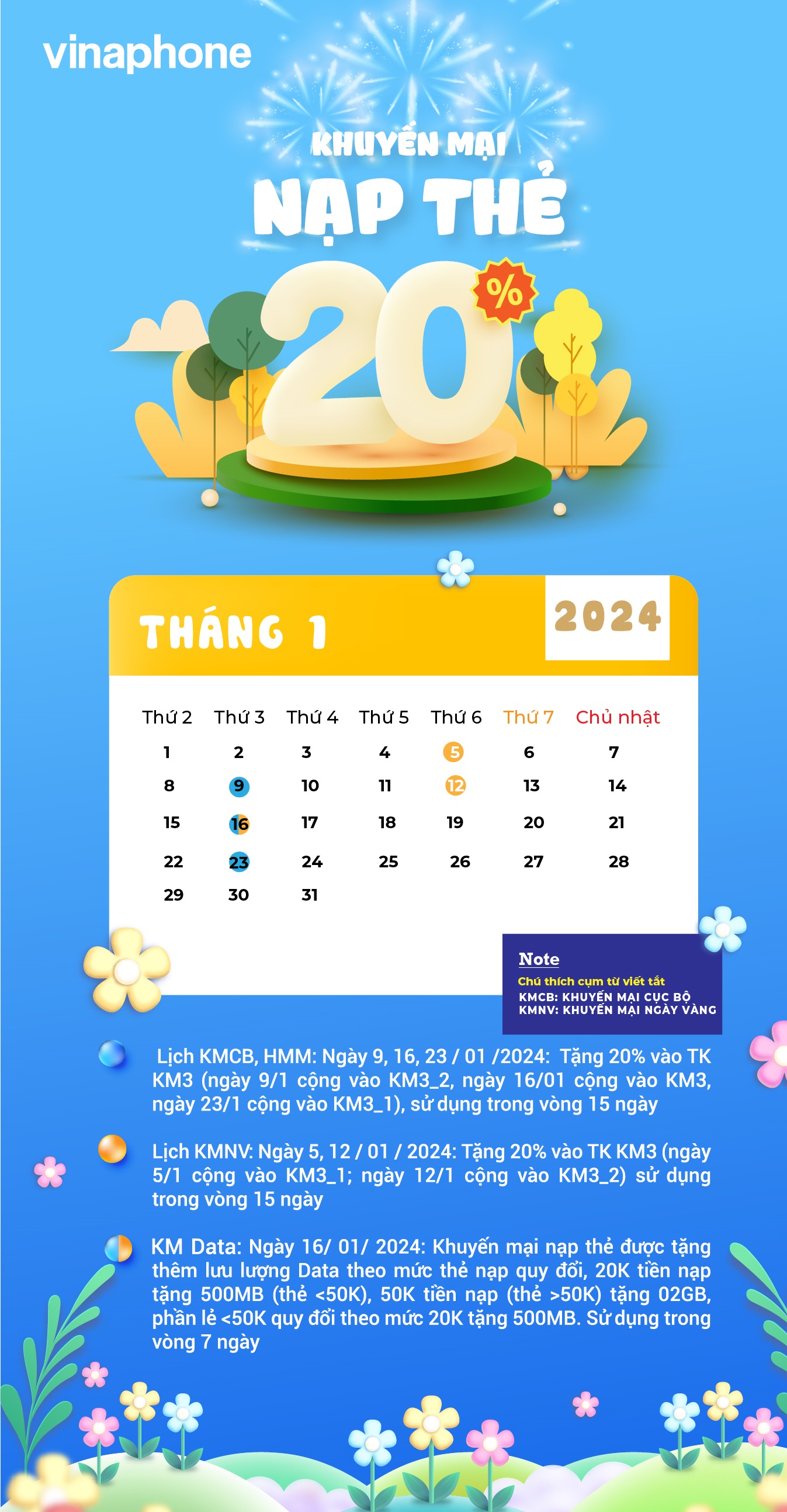 Trong tháng 1/2024, VinaPhone ưu đãi tặng ngay 20% giá trị thẻ nạp cho thuê bao trả trước. Chi tiết lịch khuyến mại nạp thẻ trong tháng như sau: